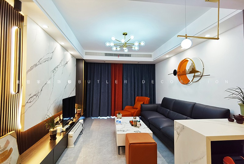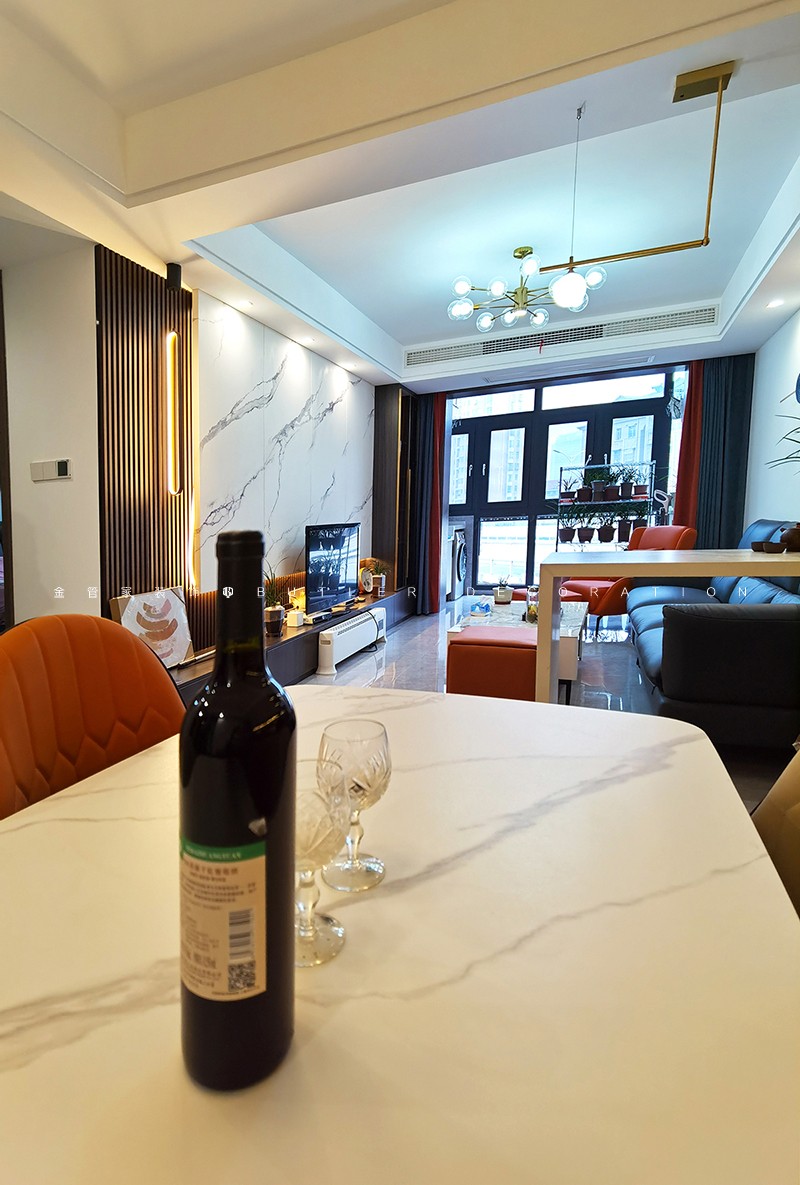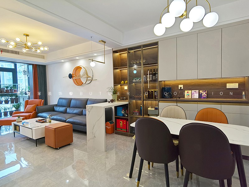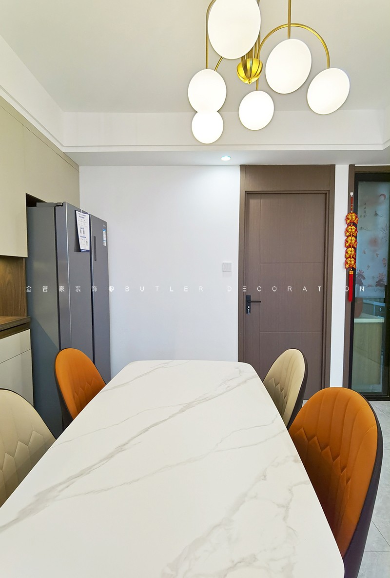 輕奢風(fēng)格裝修,以簡約而不失優(yōu)雅的設(shè)計(jì)為主調(diào)。本方案選用白色為主色調(diào),搭配深灰色沙發(fā)和橙色單人椅,點(diǎn)綴金色圓形時鐘,營造現(xiàn)代而溫馨的氛圍。餐廳區(qū)域則采用長方形大理石餐桌,搭配四把舒適餐椅,增添用餐的儀式感。整體空間中,棕色和橙色作為點(diǎn)綴色,與白色背景形成鮮明對比,讓空間更顯活力。此方案不僅注重美觀,更強(qiáng)調(diào)實(shí)用與舒適,為您打造高品質(zhì)的居家生活。
